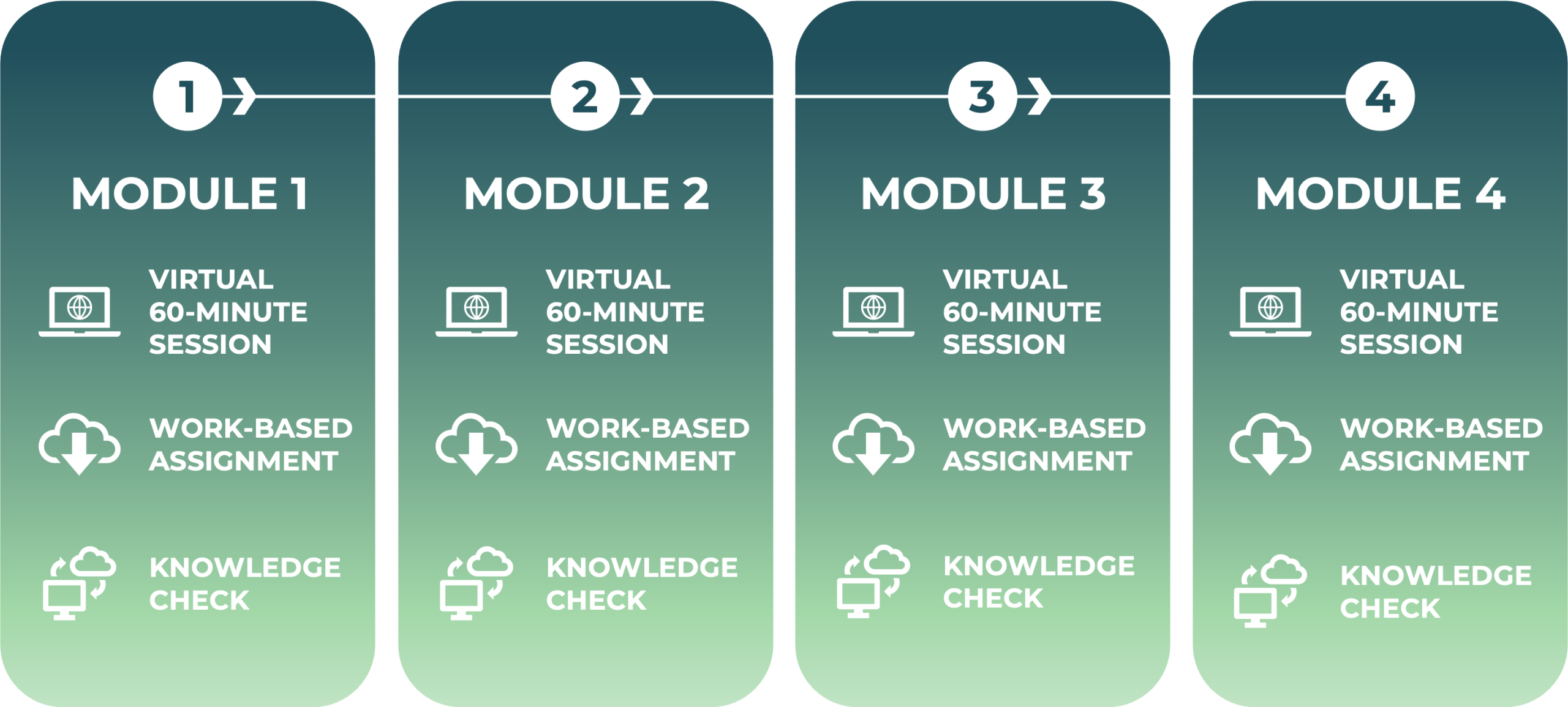 Our virtual training solutions deliver a comprehensive, full-day training experience in streamlined modules within a virtual classroom setting